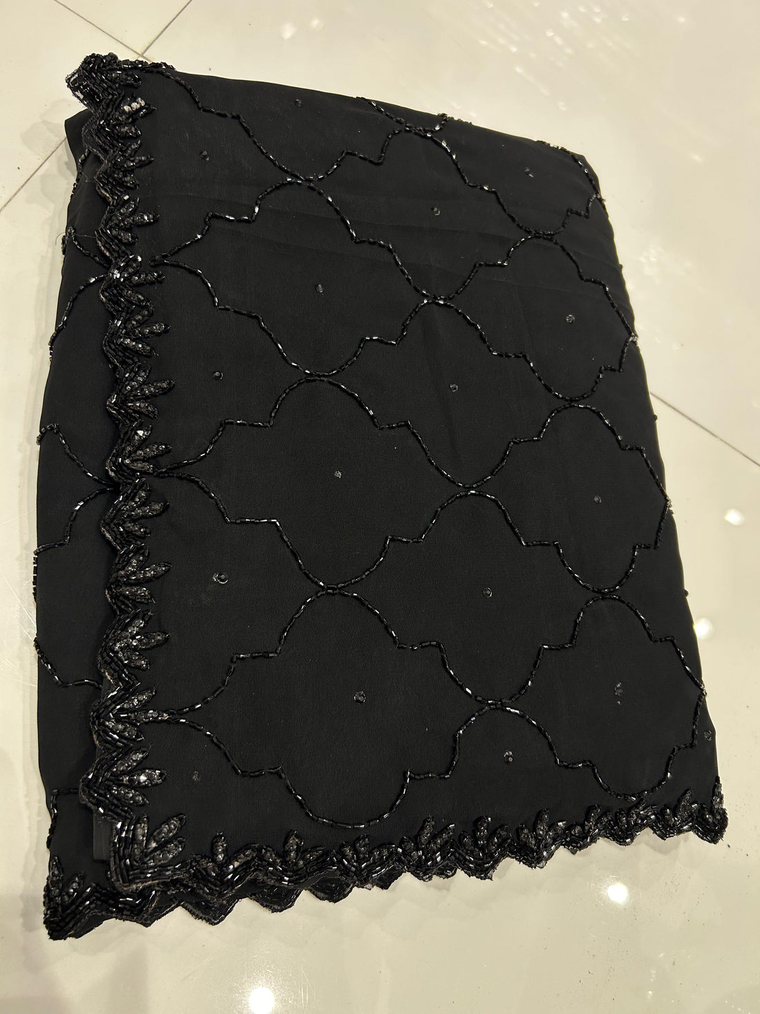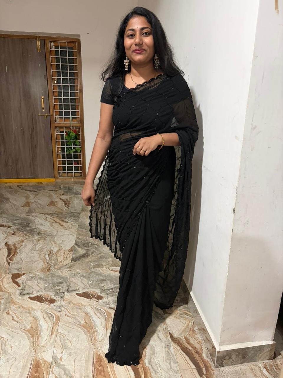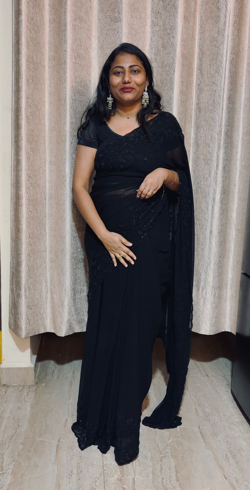Elevate your ethnic wardrobe with this exquisite black handwork georgette saree, a timeless piece that...