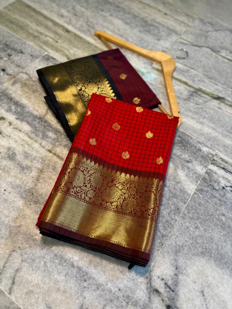 *New colour combination*Banarasi semi katan soft zari check buti silk saree Full body checks Tissu buti...